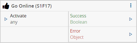 Upon activation, will send an S1F17 (Go Online) message to the driver of the equipment. If the reply matches what was expected in the correct path and with the correct success code, the task will emit a value true on the Success output. In case of the task , for some reason, is not able send the message or if it receives an unexpected reply, an Error is emitted.