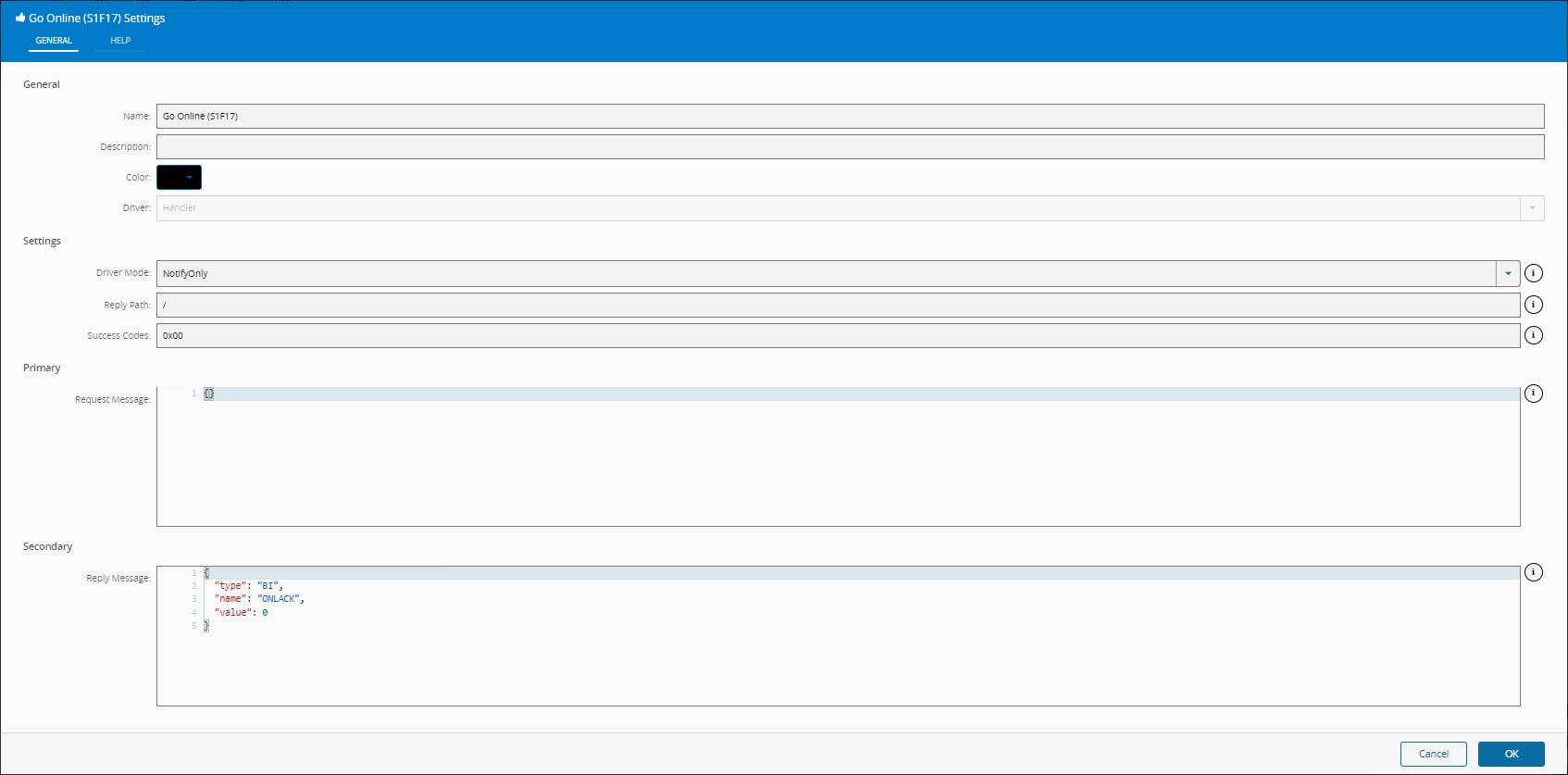 | Reply Message | Object | { "type": "BI", "name": "ONLACK", "value": 0 } | Enabled when Driver Mode is different of NotifyOnly. Secondary/Reply Message to send |