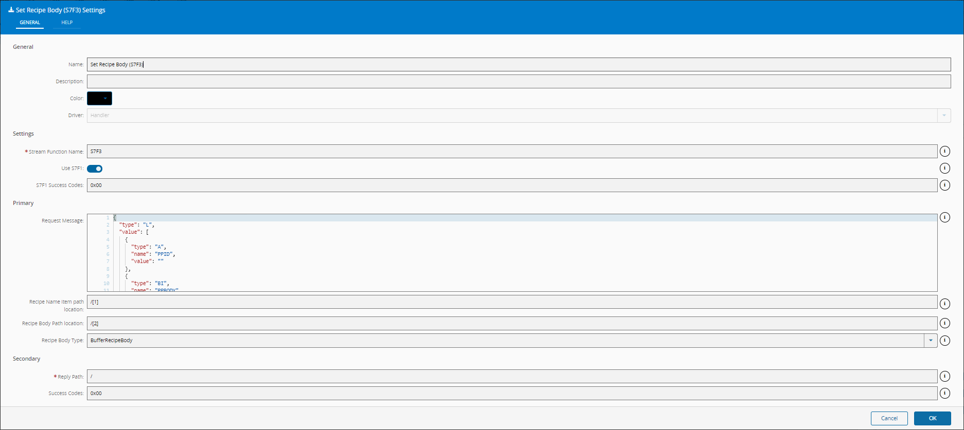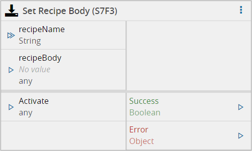 When activated, the Set Recipe Body task will send an S7F3 (Set Recipe Body) SECS/GEM message to the equipment.