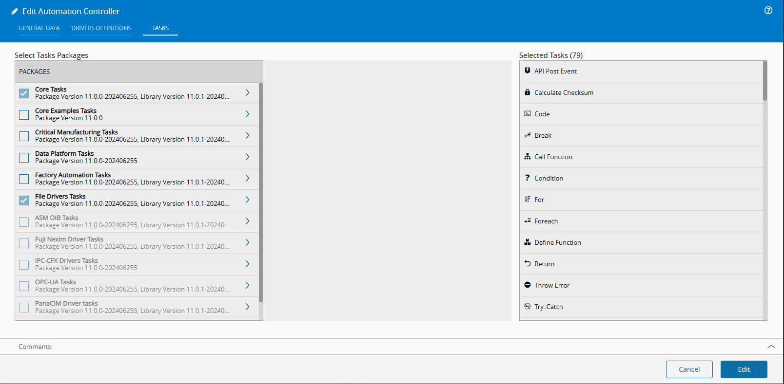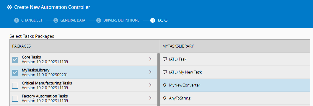 To use the Automation Tasks Library in the new Automation Controller the process is similar to choosing the previous packages. Previous packages will be rendered with the prefix Package Version, packages that are Automation Task Libraries will have the prefix Library Version. The system supports the merge of packages that are a hybrid of automation task libraries and non-automation task libraries. If the package is a merged, it will show both prefixes followed by a the version and separated by a comma.