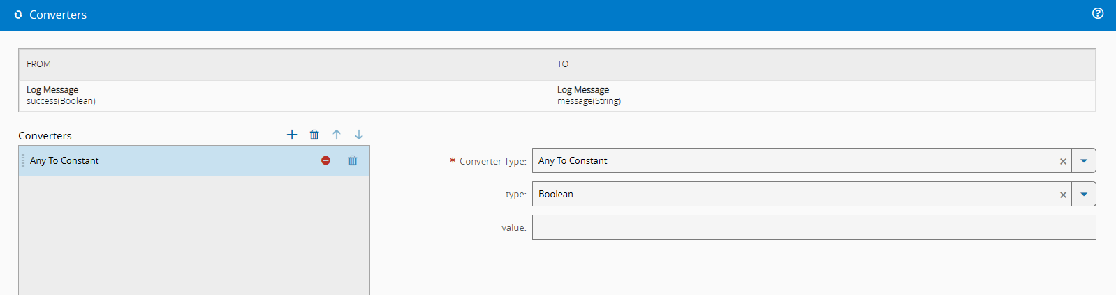 Notice that the converters are very simple. They will have a root definition of what the input and output type they are converting between are, and then they allow for additional parameters to be added in the settings.