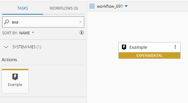 The metadata, describes a task that has a name of example, display name Example and it is currently marked as Experimental. The task will also, have as an icon the automation event, and it will be grouped under the category System/MES in the section Actions. This task is also only for a workflow of type DataFlow.