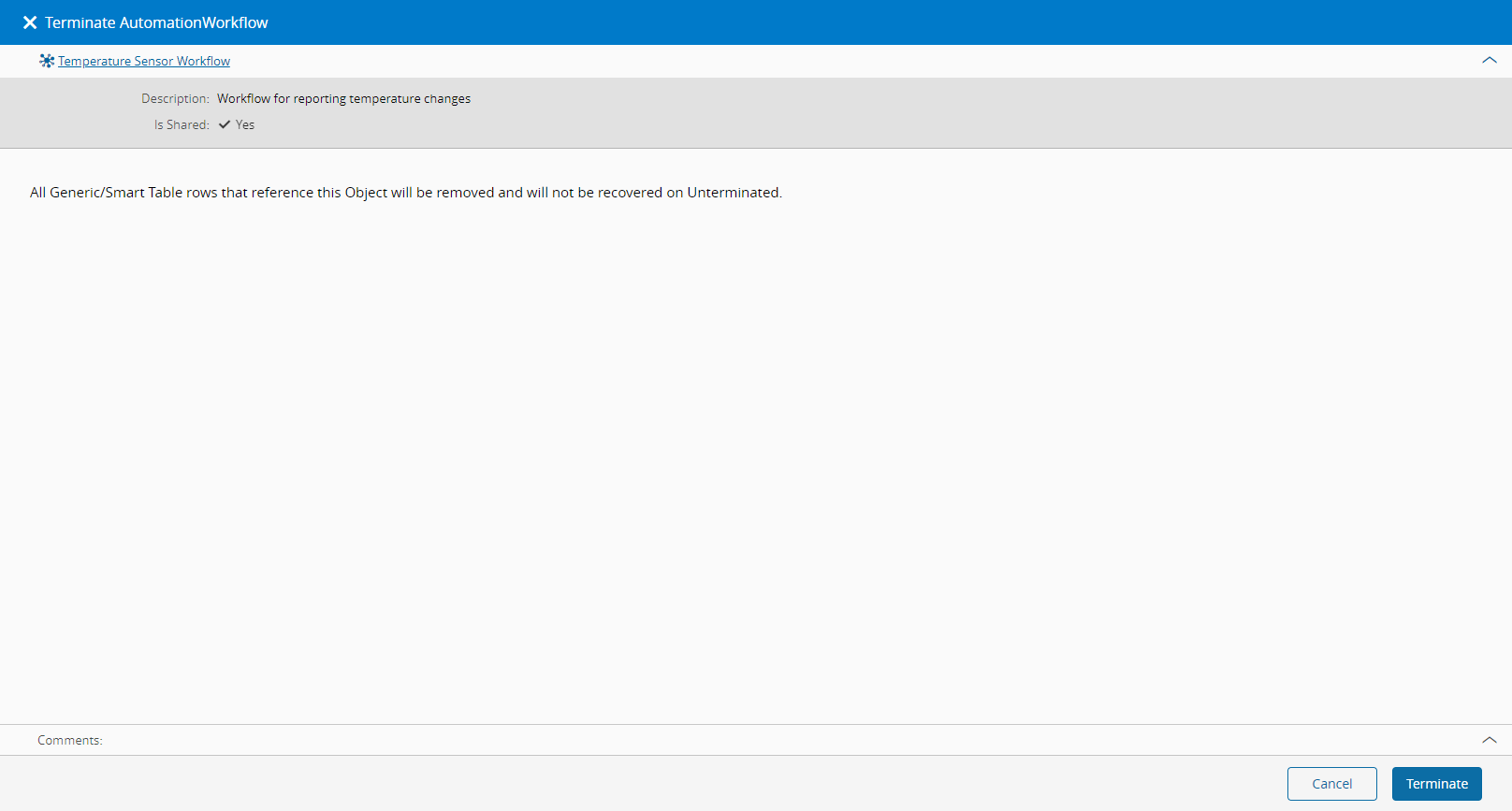1. Select Terminate to perform the operation. All generic/smart table rows that reference the current object will be removed and will not be recovered if the object is unterminated at a later point.