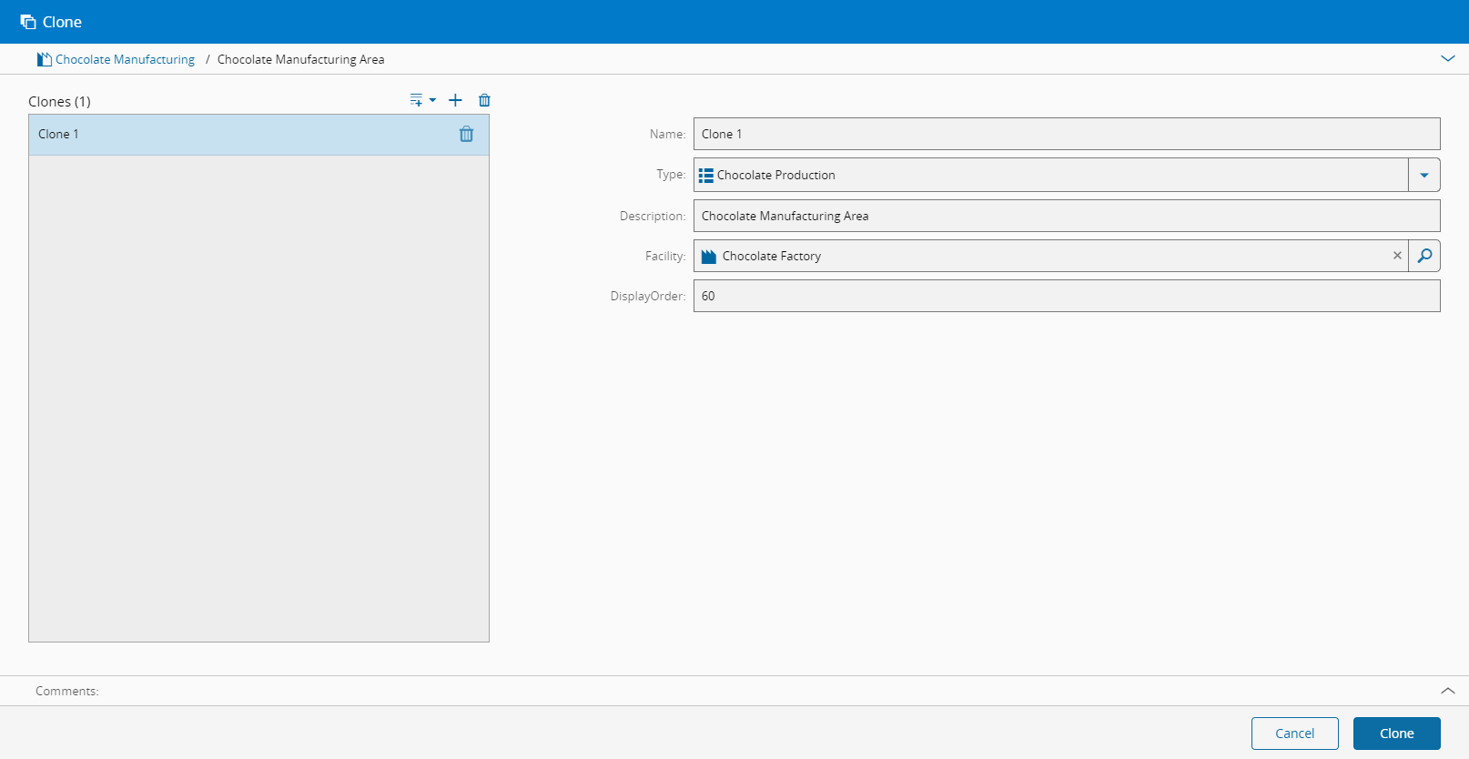 The Clone Area wizard can be called from the Area page within the Business Data Group. The default values will be taken from the current Area to be used as a base for the new object.