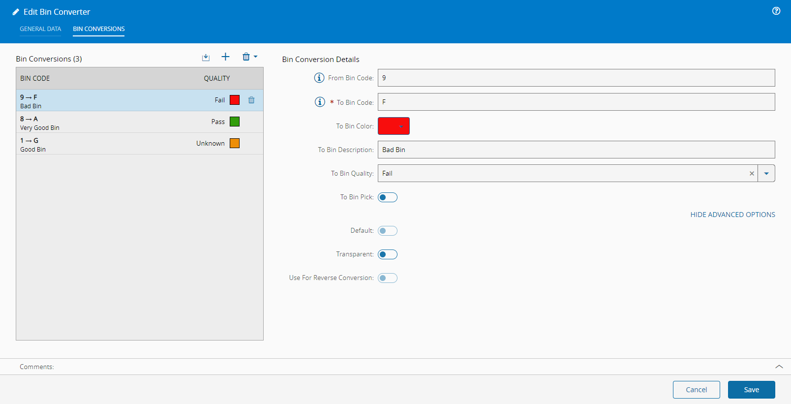 The Edit Bin Converter wizard can be called from the Bin Converter page within the Business Data Group.