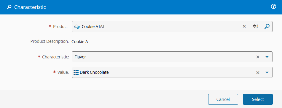 Characteristic - assign a characteristic for each BOM Product (optional). If you select the Browse button, a new dialog will be displayed where you can choose the Product, a Characteristic associated with that Product and and its corresponding Value. Once you choose the Select button, the Characteristic and Value fields in the Manage BOM items wizard will be automatically populated.