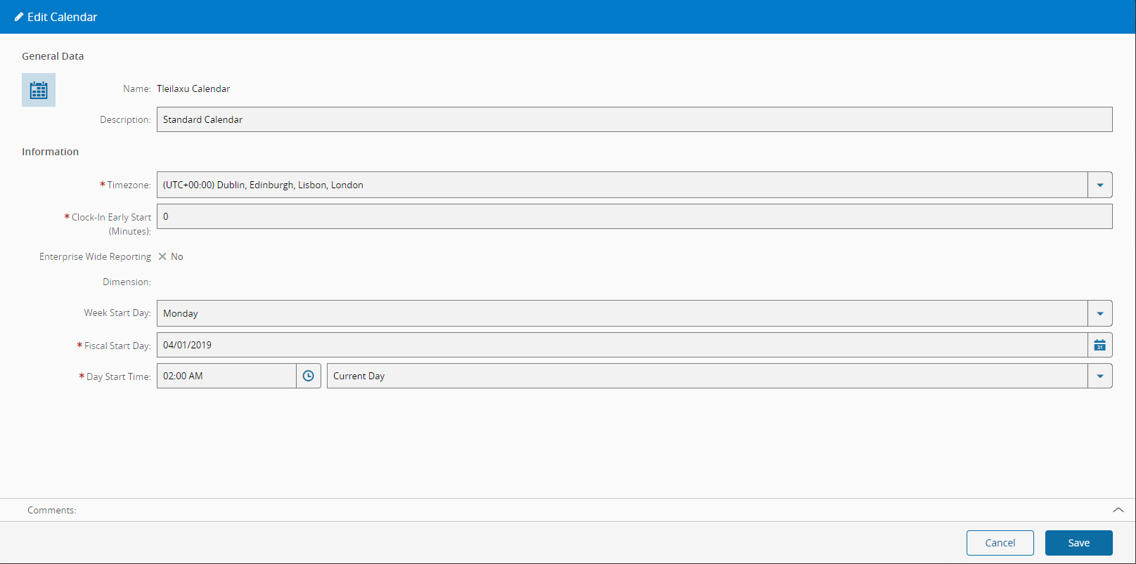 The Edit Calendar wizard can be called from the Calendar page within the Business Data Group.