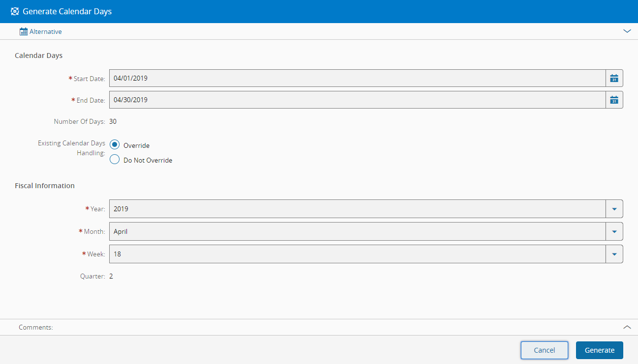 - Select whether the generation of Calendar Days will override existing ones, or if only Calendar Days that do not exist will be generated.