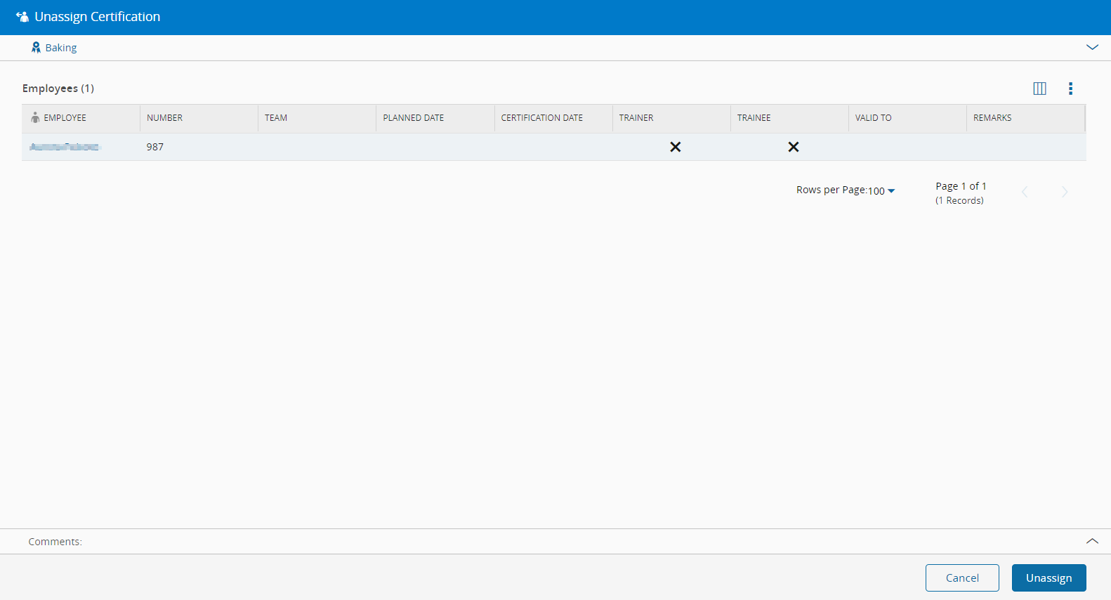 To unassign one or more Employees from the Certification, open the page of the Certification, select the Employees you want to unassign from that manager and select the Unassign button in the Employees section of the page.