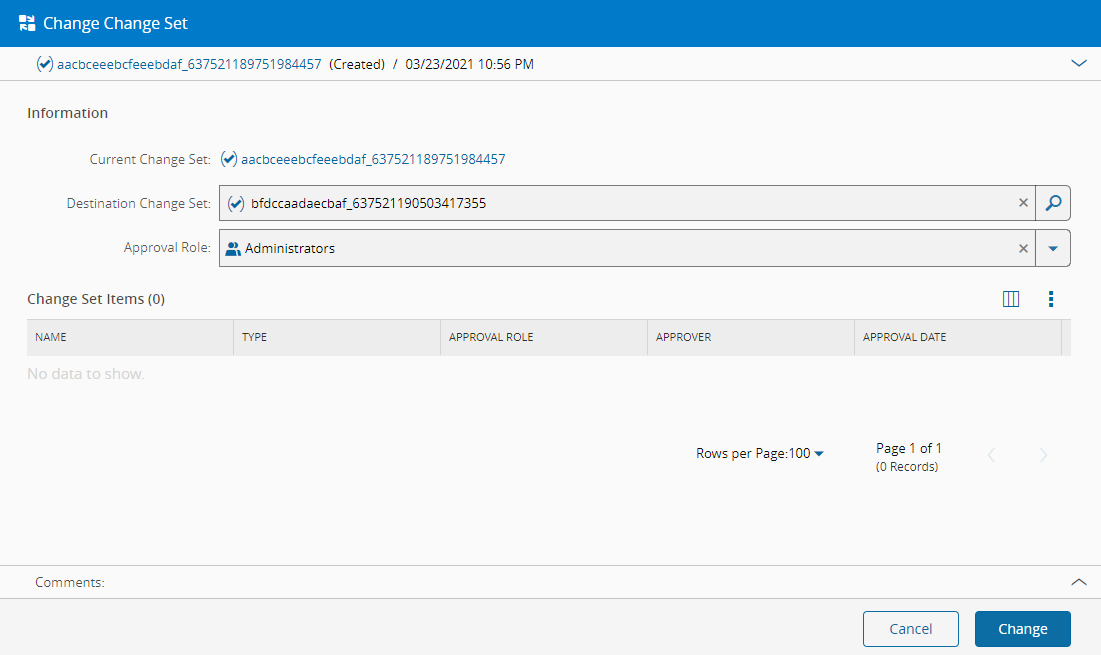 If a Change Set has an approval context defined by Role, the Role of the User approving the Change Set must match the Role defined in the ChangeSetApprovalContext Smart Table entry. Additionally, if there is a approval context defined by workflow, the workflow defined for the approval must match the workflow in the same entry of the Smart Table.