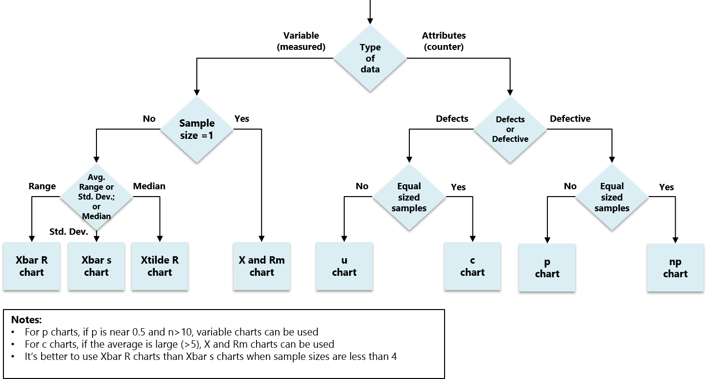 | Fraction Defective (p) | Attributes | Independent | Variable usually ≥ 50 | Binomial | Large (≥1.5σ) |