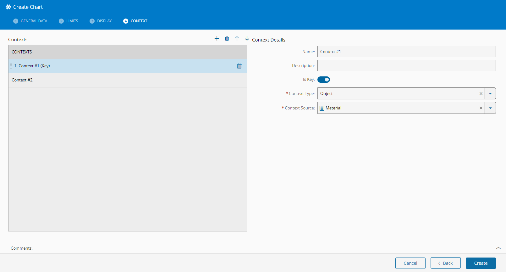 Add as many contexts as needed (select to add, to remove, and order the contexts with the and buttons). You need to specify at least one key (minimum), and for each context information element you should provide: