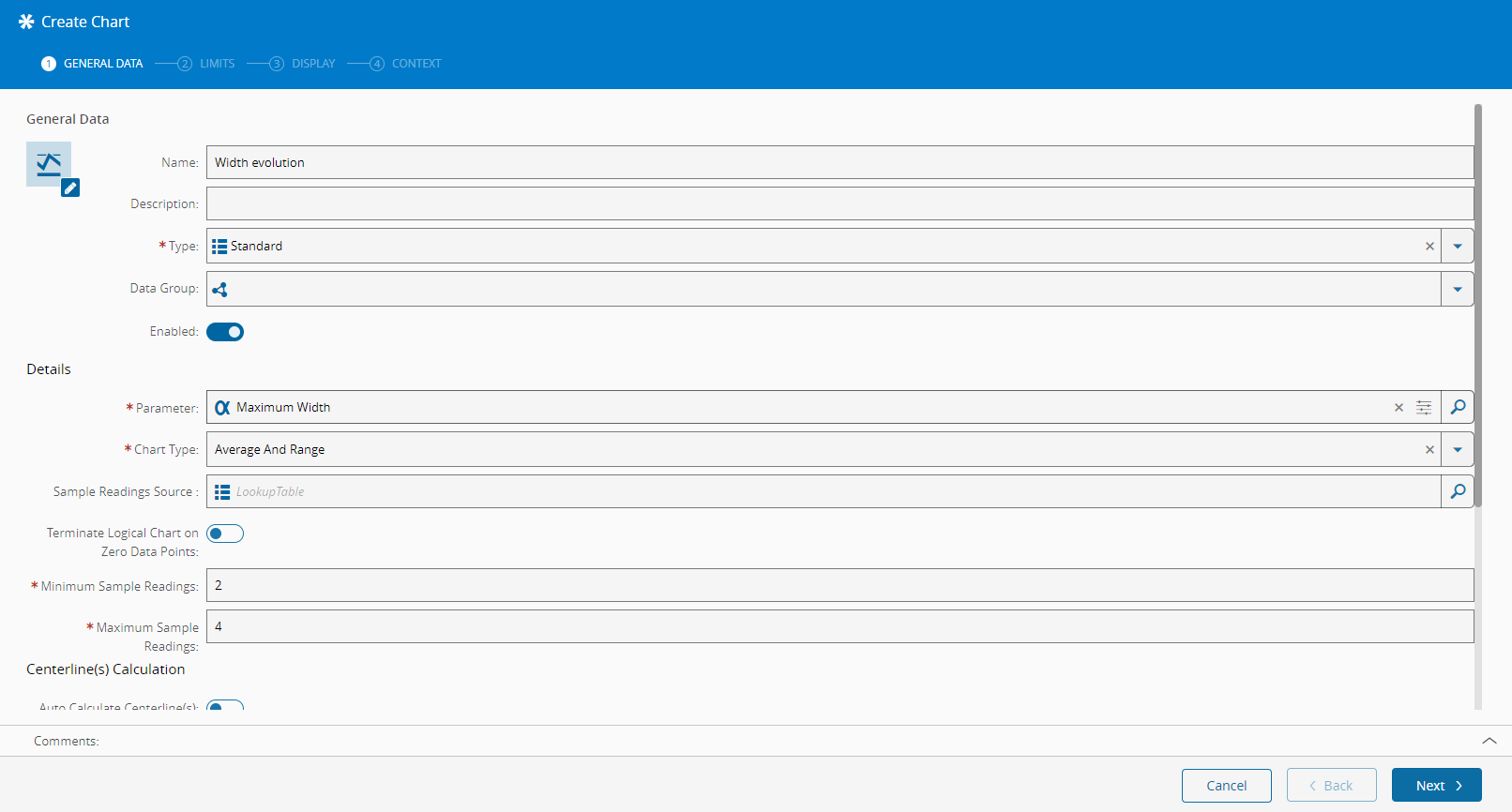 - Specify the value for Centerline 1 (the meaning depends on the Chart type) and for variable Charts; do the same for Centerline 2 (the meaning depends on the Chart type).