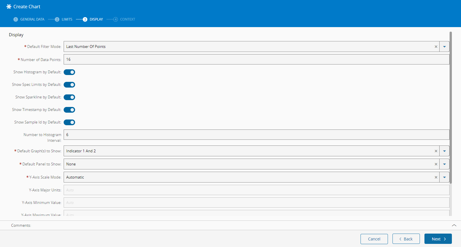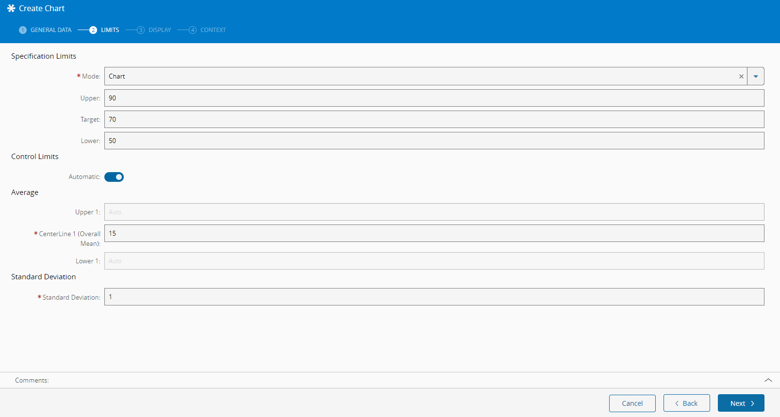 - Specify whether the Control Limits are of type Automatic (using the standard statistical formulas) or not. If the Control Limits are not Automatic, you can optionally set the Upper and Lower Control Limits as well as the centerlines.