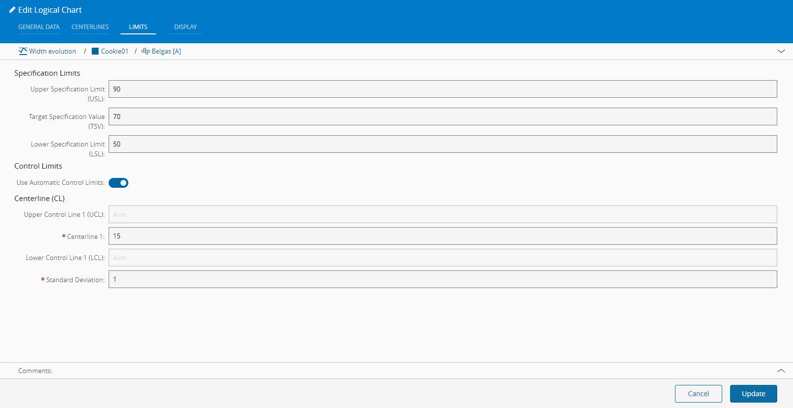 3. You can edit General Data, Centerlines, Limits, and Display information. However, the Name of the Logical Chart cannot be altered.
