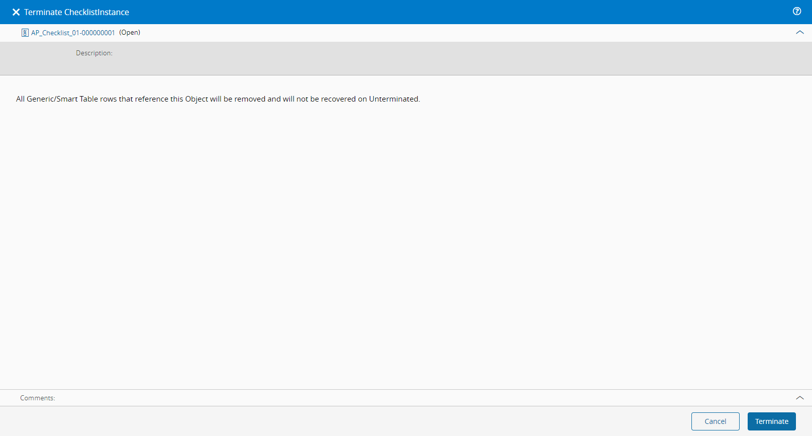 - Select Terminate to perform the operation. All generic/smart table rows that reference the current object will be removed and will not be recovered.