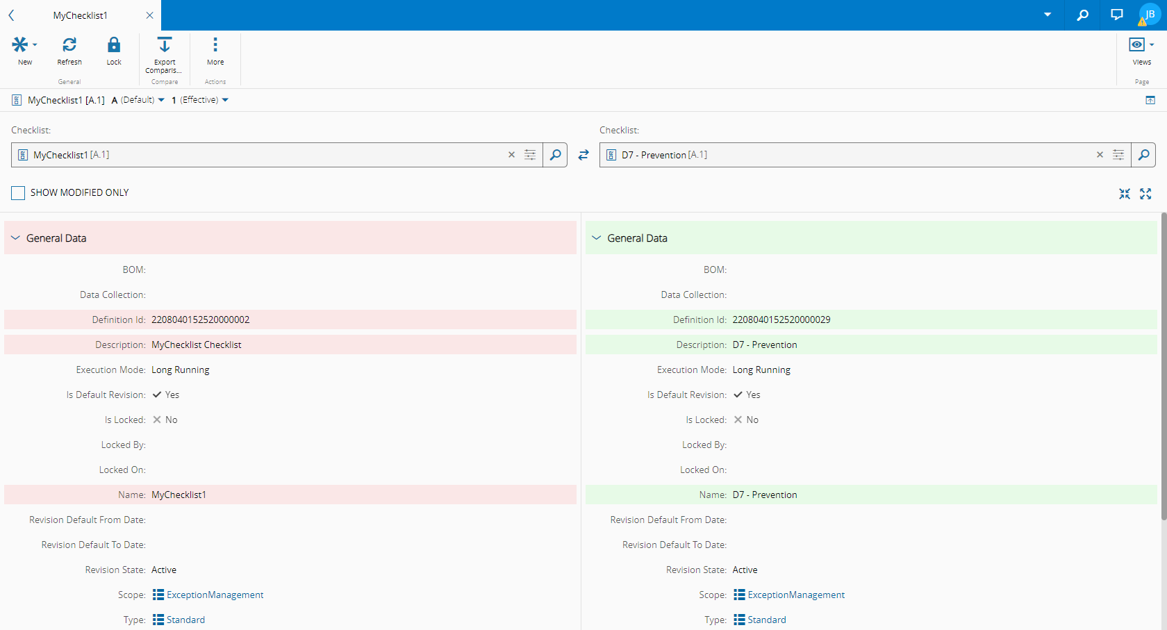This view provides a quick visual comparison between the selected entity version and any other version that can be selected through it. You can also export the comparison results to a PDF file through the Export Comparison button on the top ribbon. For more information, see Compare Entity Versions.