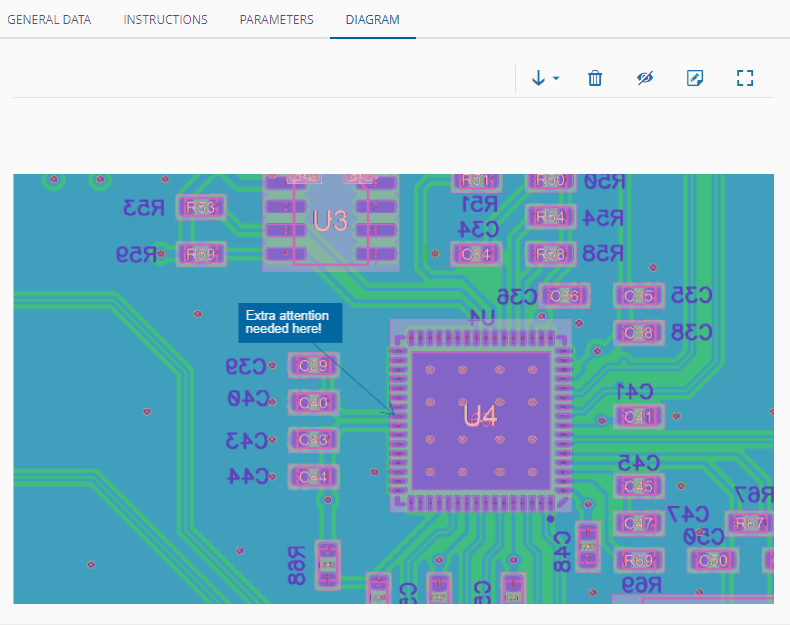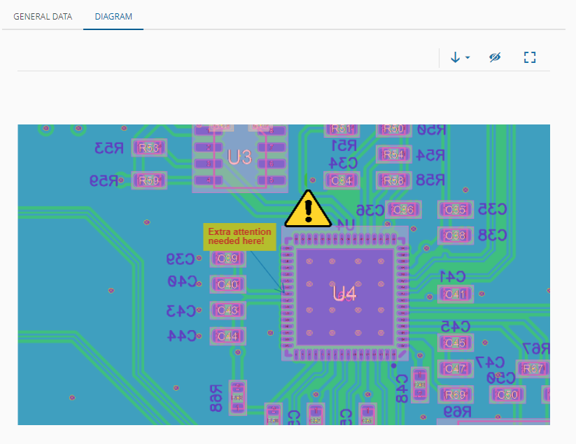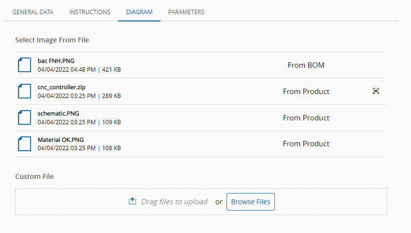 In the Diagram tab you can also have direct access to images, diagrams, and other document types from the Product that are associated to the BOM, which is associated to the Checklist. As well as images, diagrams, and other document types from the BOM that is associated to the Checklist: