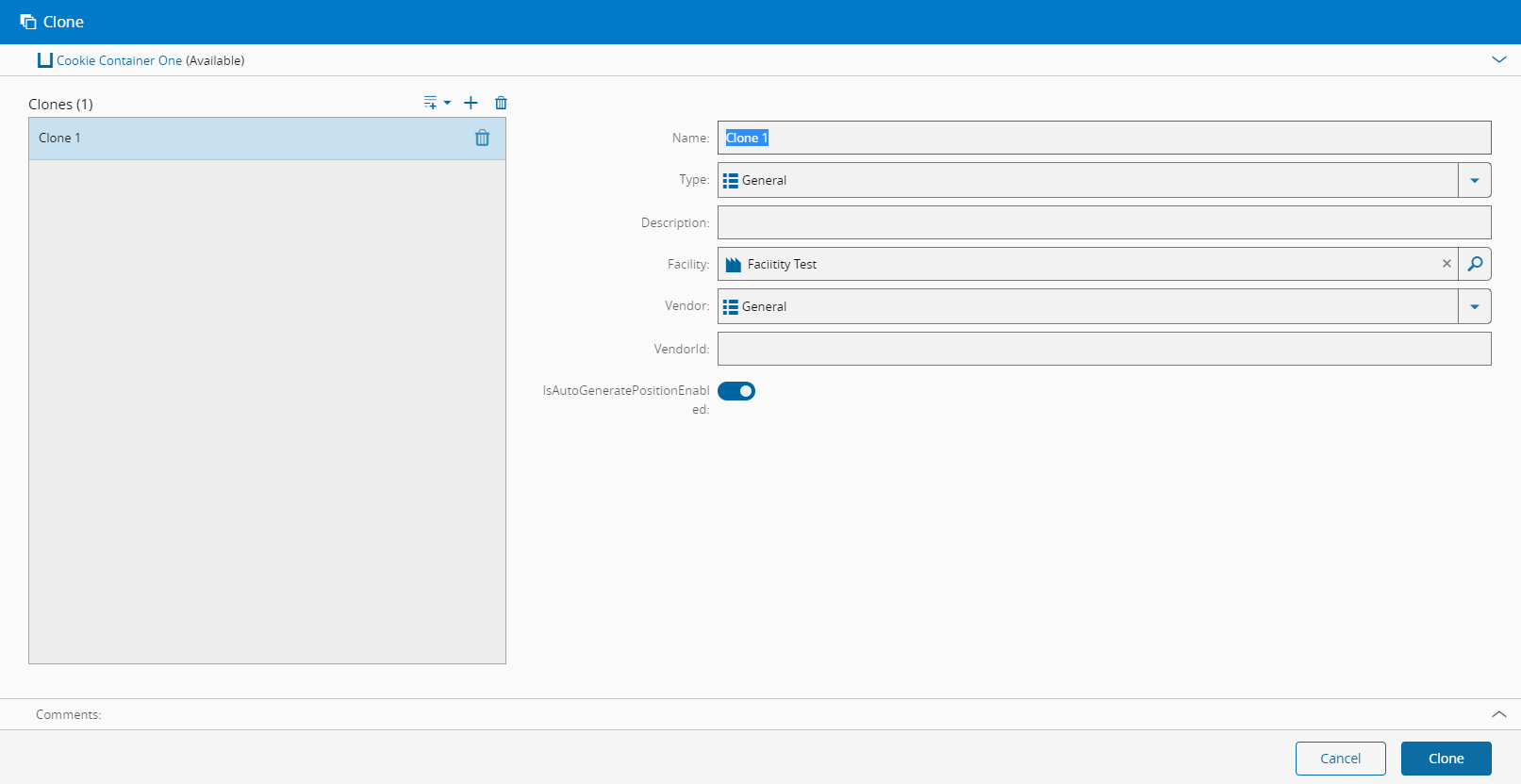 - Press Clone to complete the transaction and a new object will be created.