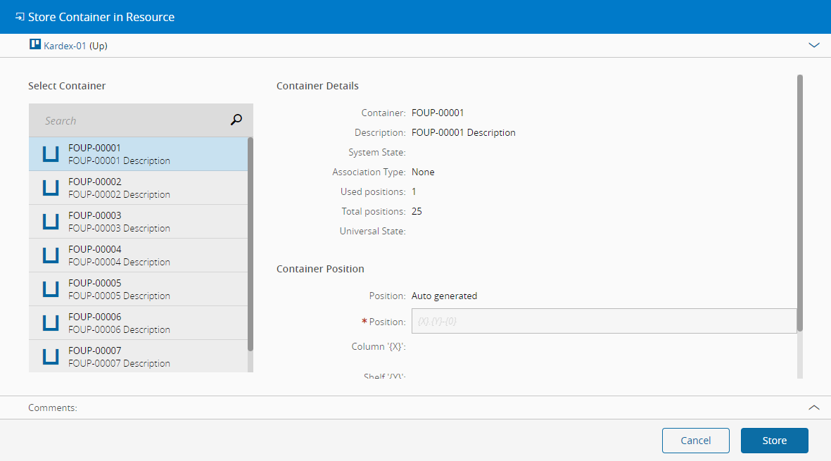 true, provide a valid position. Note that in this case the provided position address must be compliant with the defined Resource position address format. - Select Store to complete the transaction.