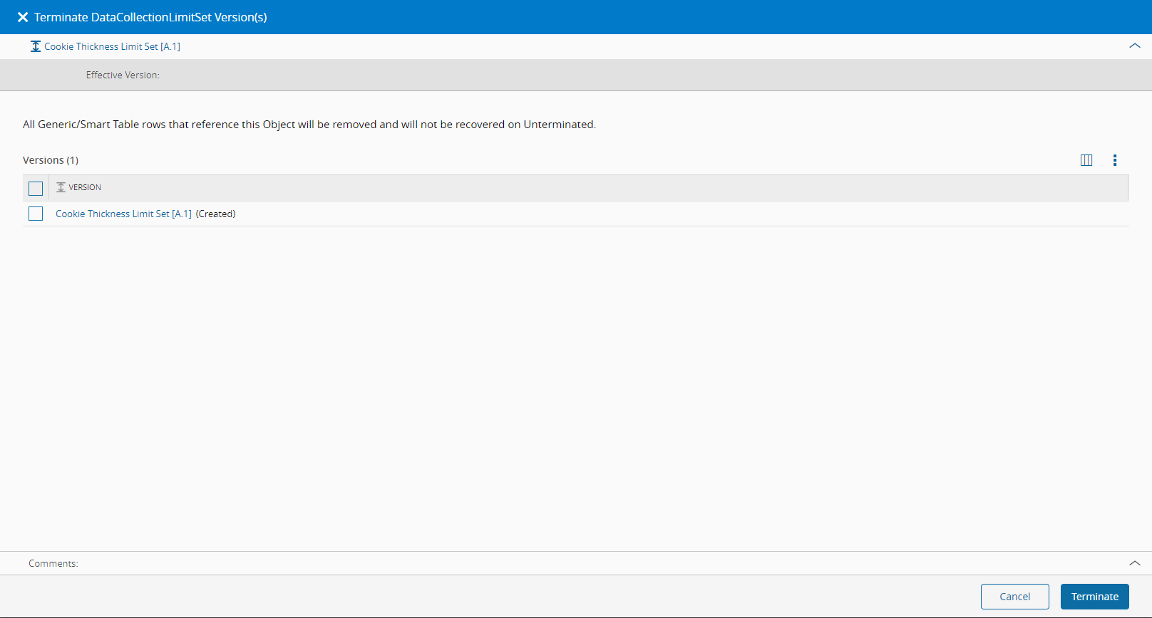 - Select Terminate to perform the operation. All generic/smart table rows that reference the current object will be removed and will not be recovered if the object is unterminated at a later point.