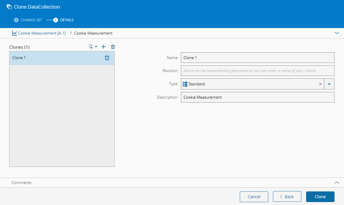 The Clone Data Collection wizard can be called from the Data Collection page within the Business Data Group. The default values will be taken from the current Data Collection to be used as a base for the new object. Since this is a versioned entity, there are two possible procedures: entity and revision cloning, both of which are available from the main details page. Select Clone on the top ribbon, followed by Entity if you want to clone the complete entity along with the first revision and version of the new entity, or Revision if you want to clone only a single revision. In either case, a Change Set must be supplied for a version of the revision to be made effective in the future.
