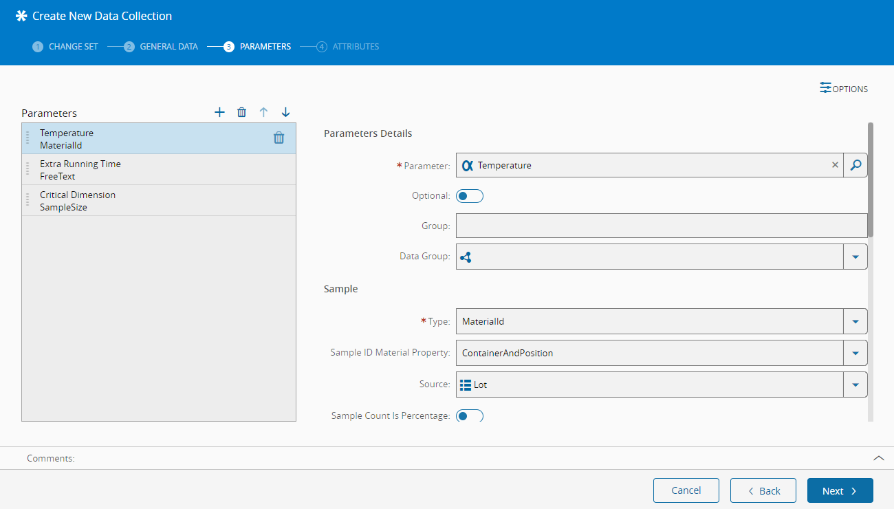 - Whether the parameter is optional in the Data Collection.