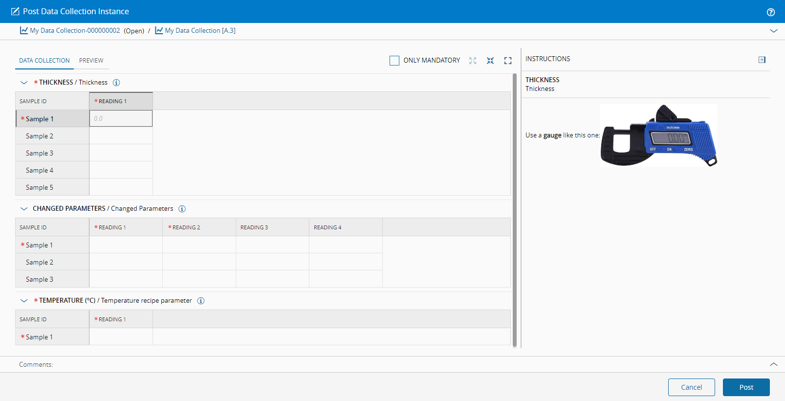 - Material ID (the sample names must refer to valid material names in the hierarchy of the Material for which the data is being collected).