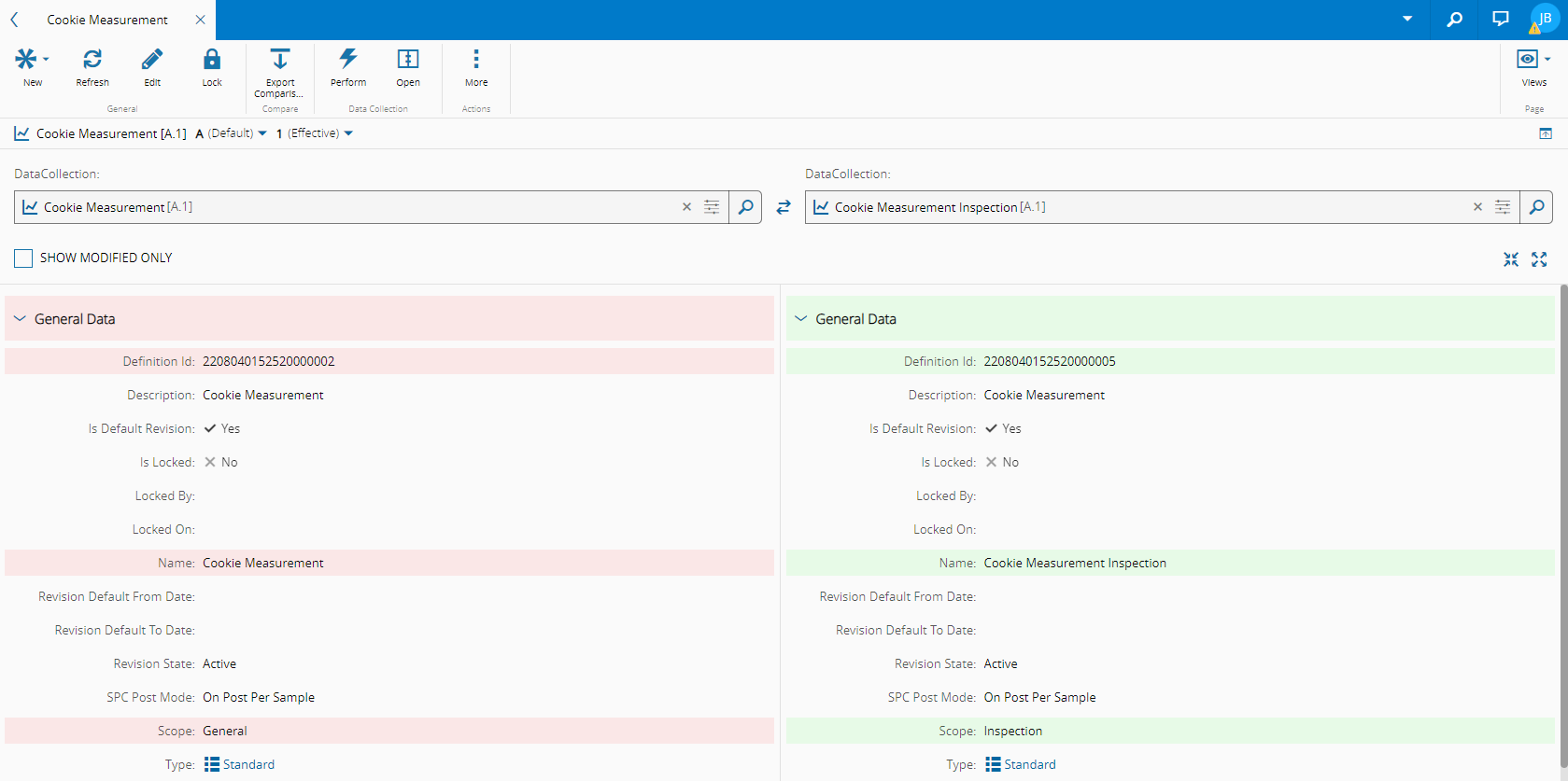This view provides a quick visual comparison between the selected entity version and any other version that can be selected through it. You can also export the comparison results to a PDF file through the Export Comparison button on the top ribbon. For more information, see Compare Entity Versions.