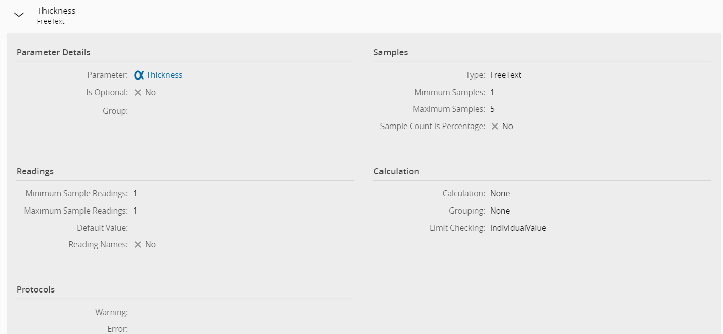 - Parameters - displays information on the Parameters that are part of the Data Collection.