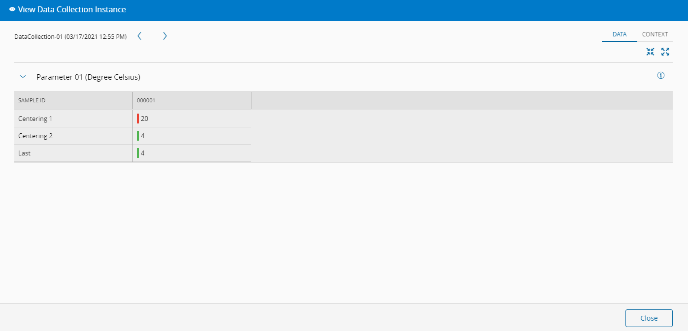 The View Data Collection Instance wizard can be called from the Instances section of the Data Collection page within the Business Data Group or through the Step Sample section of the Inspection Order page.