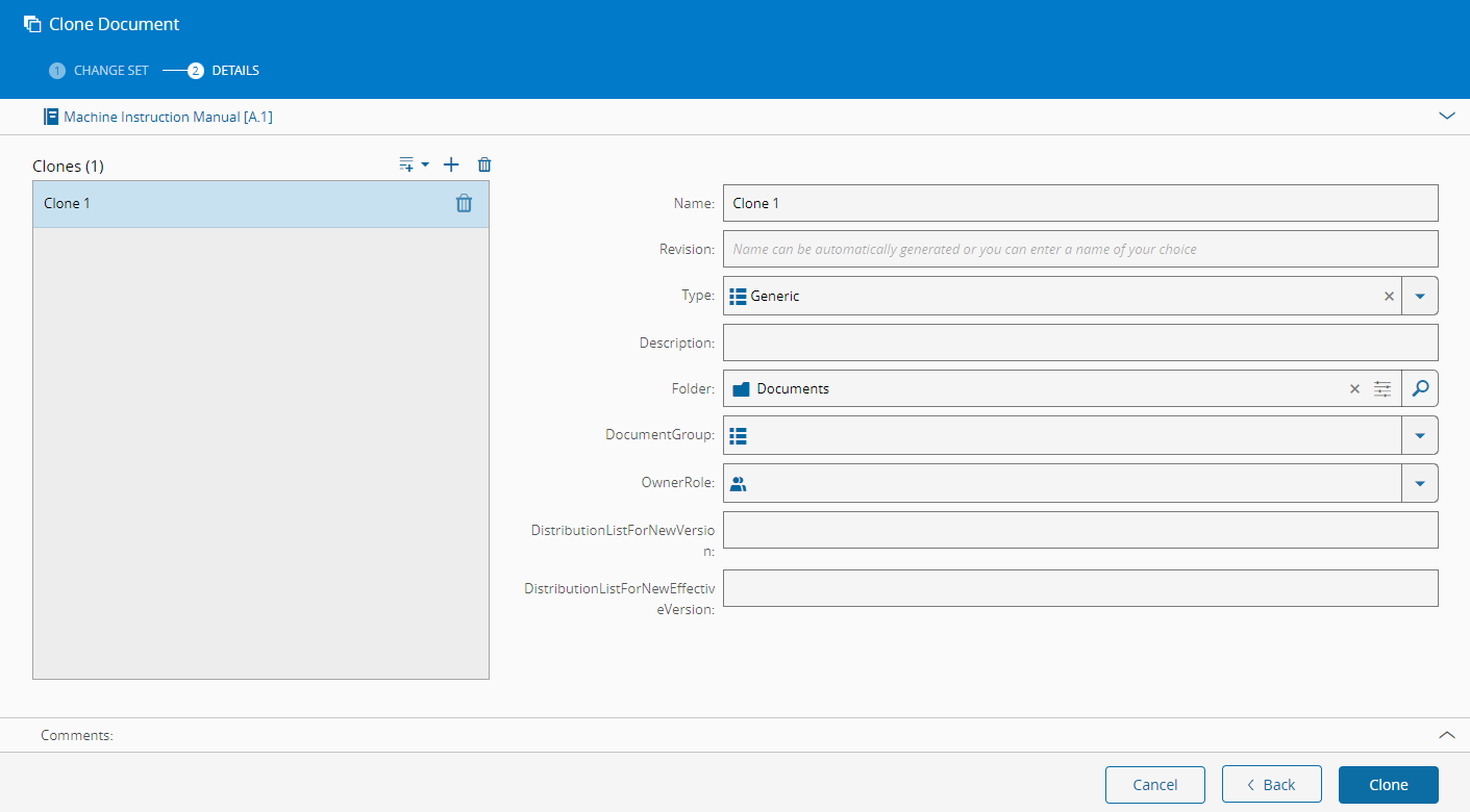 The Clone Document wizard can be called from the Document page within the Business Data Group. The default values will be taken from the current Document to be used as a base for the new object. Since this is a versioned entity, there are two possible procedures: entity and revision cloning, both of which are available from the main details page. Select Clone on the top ribbon, followed by Entity if you want to clone the complete entity along with the first revision and version of the new entity, or Revision if you want to clone only a single revision. In either case, a Change Set must be supplied for a version of the revision to be made effective in the future.