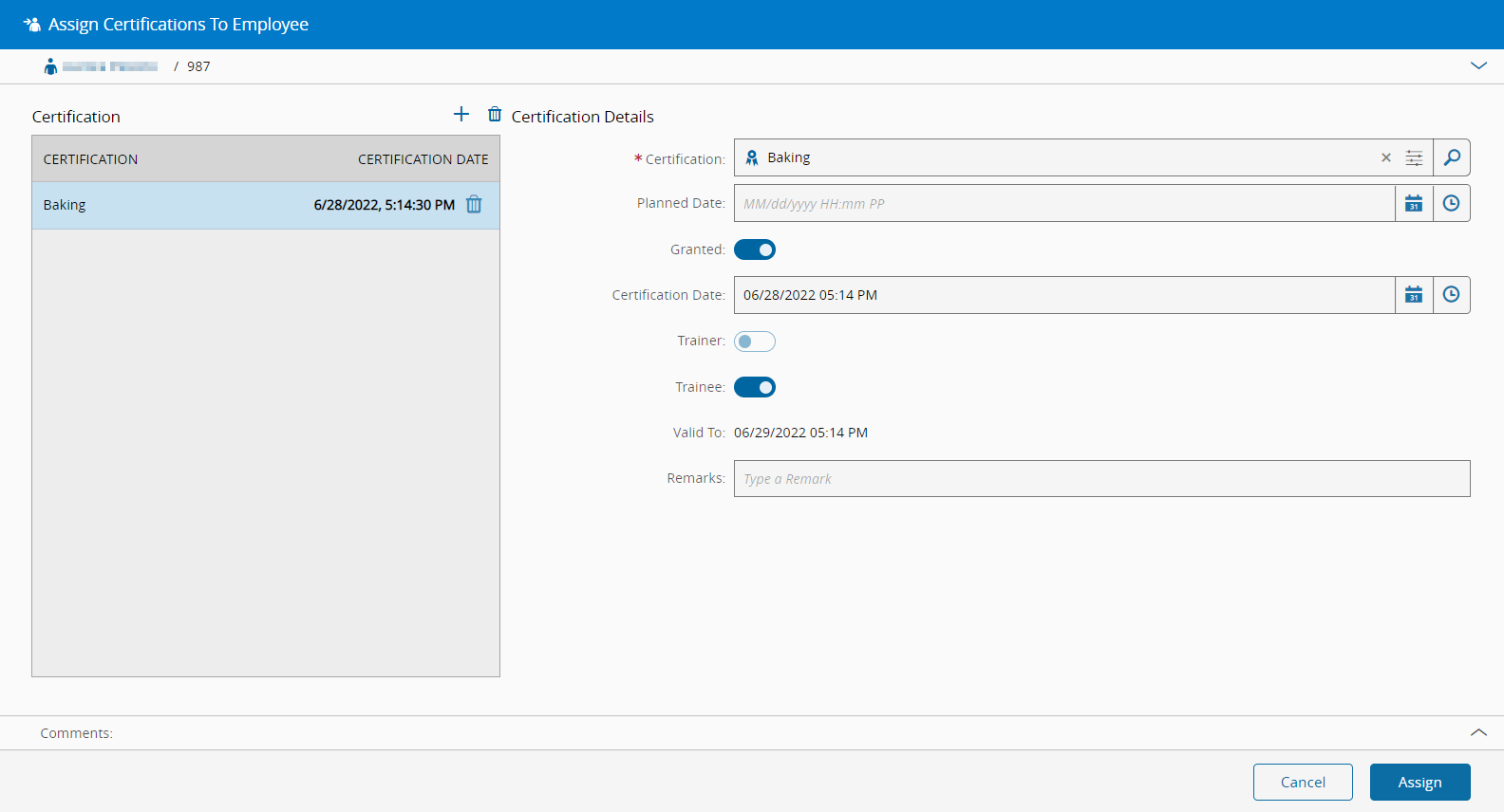 Certification Date + Training Maximum Duration. - Optionally enter a remark for the assignment.