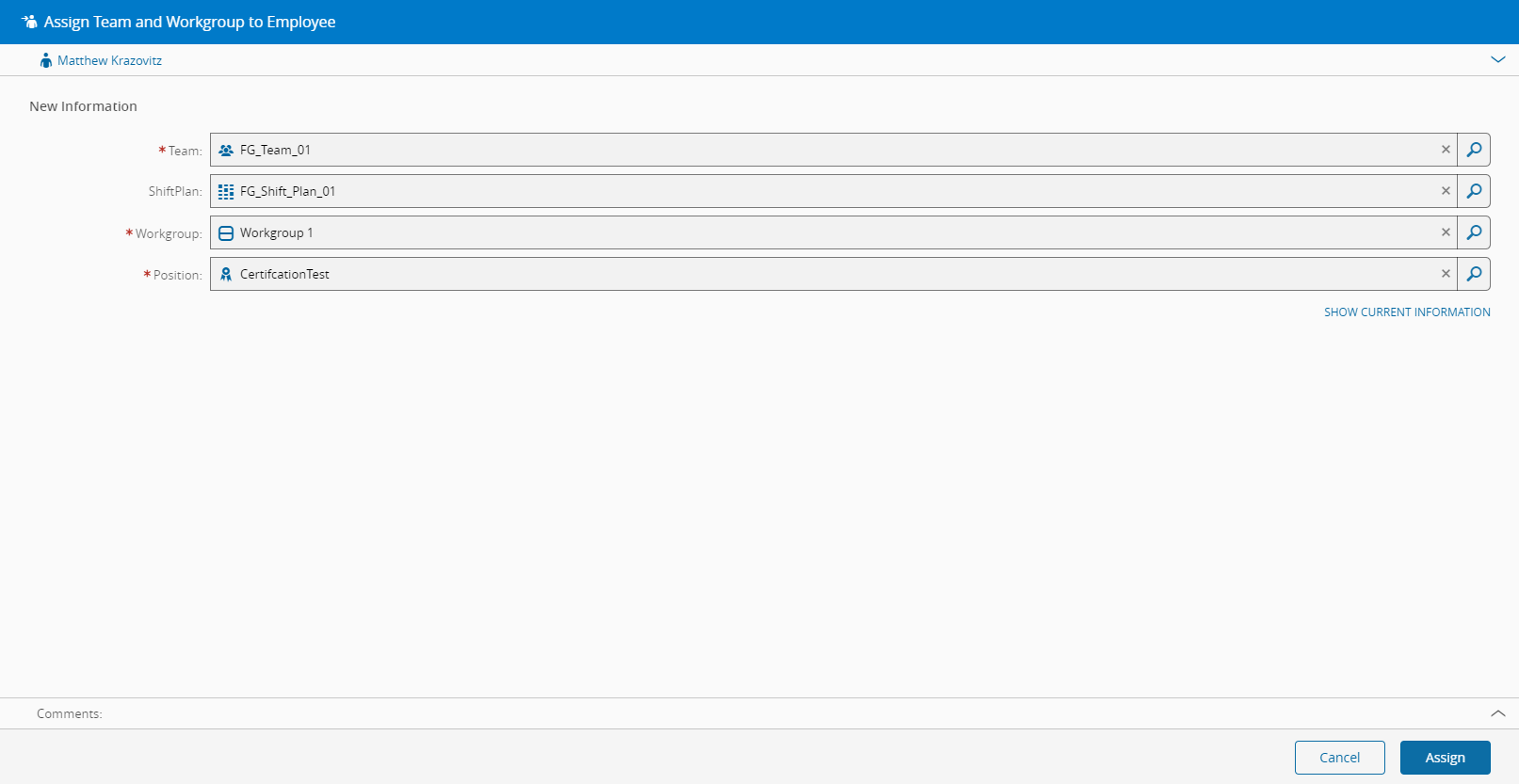 Select the new Team, Shift Plan, Workgroup and Position where to assign the Employee. The system will also list the impact of assigning the Employee to the new Team and Workgroup.
