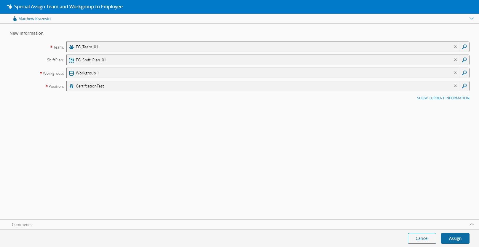 2. Select the new Team, Shift Plan, Workgroup and Position where to assign the Employee. The system will also list the impact of assigning the Employee to the new Team and Workgroup.