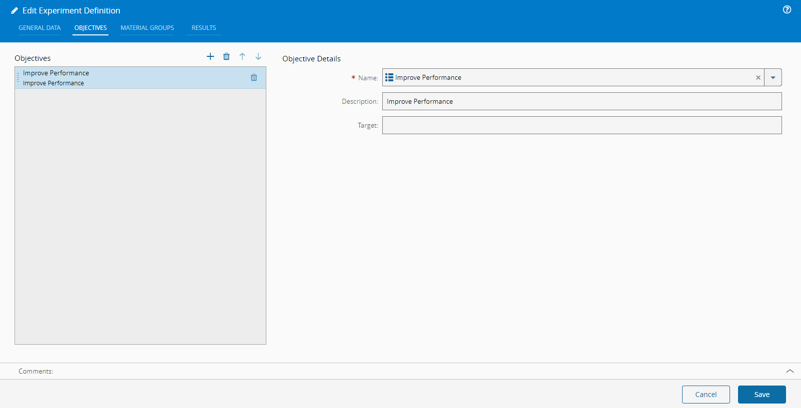 - Define a set of objectives for the Experiment Definition, by adding, removing, and editing the objective records of the Experiment Definition.