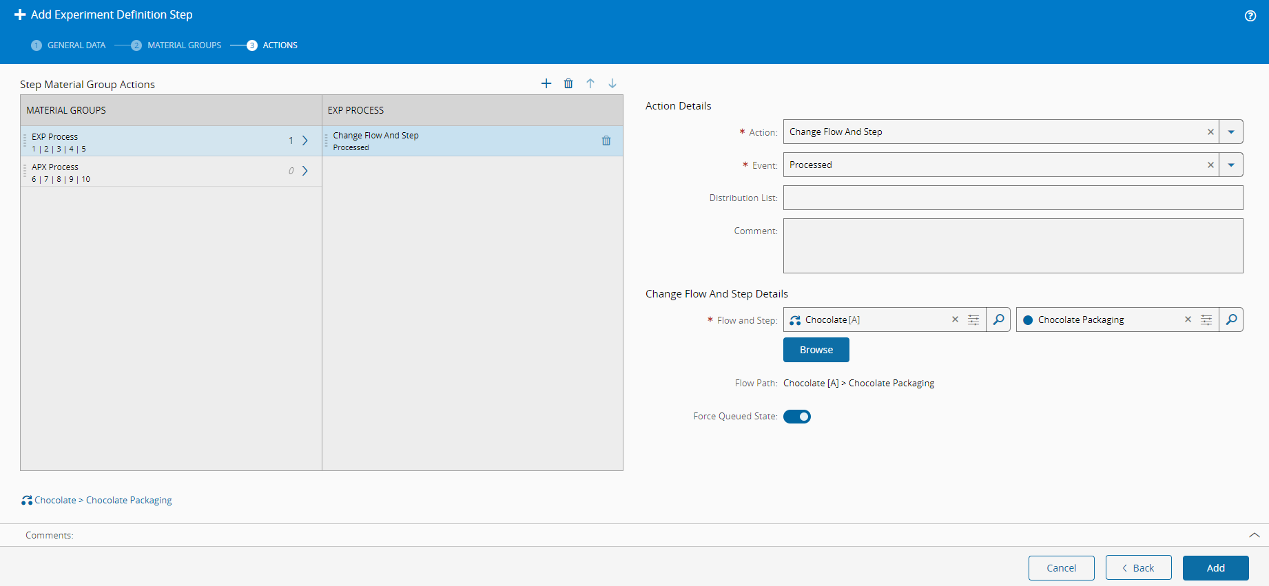 Provide an Action for any Material Groups, at any given step. In the Action Details, choose the Action and Event at which the step operation is going to be triggered. For more information, see Experiment Actions.
