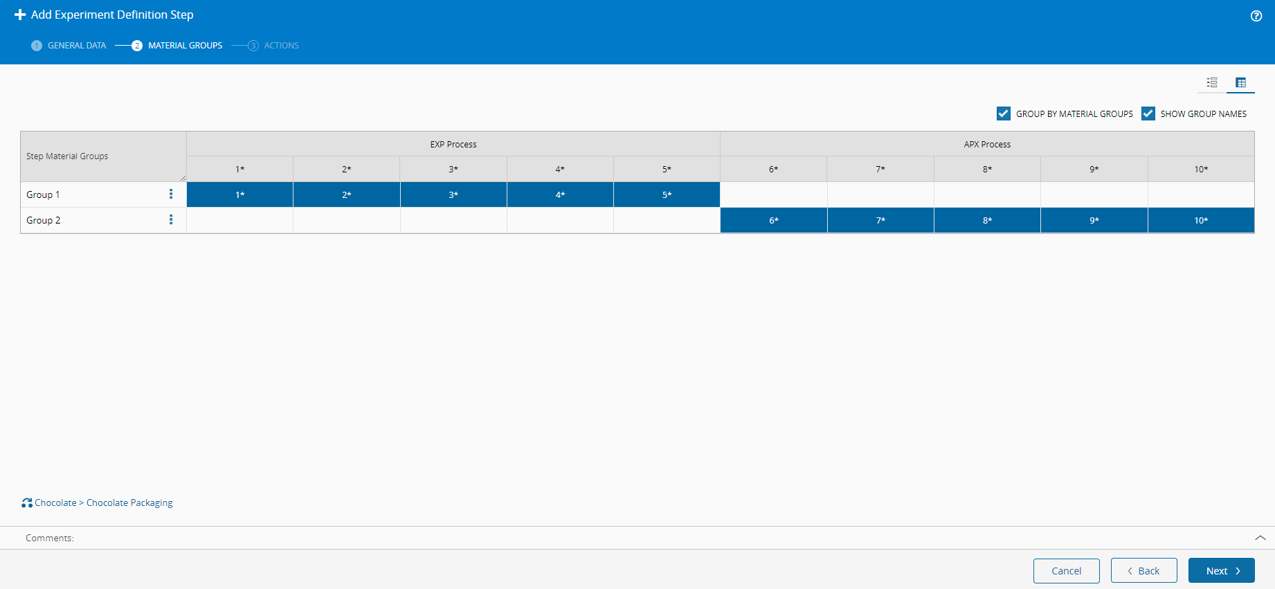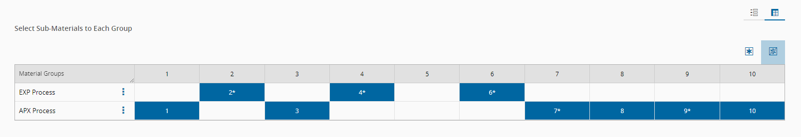 If you want to have a clearer overview of the Step Material Groups and sub-material assignment, select the matrix icon, on the top-right corner of the screen, to see the assignment grid.