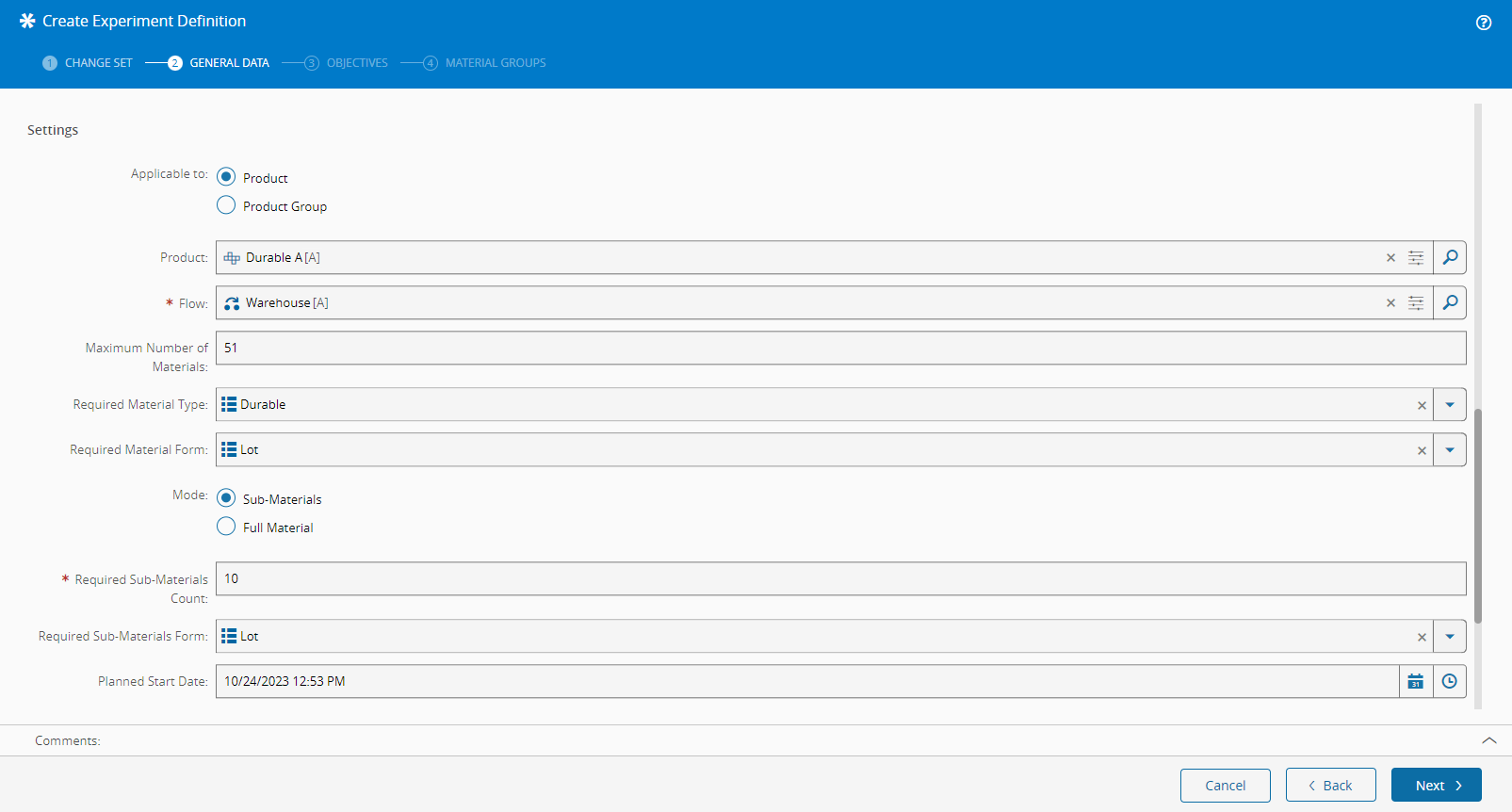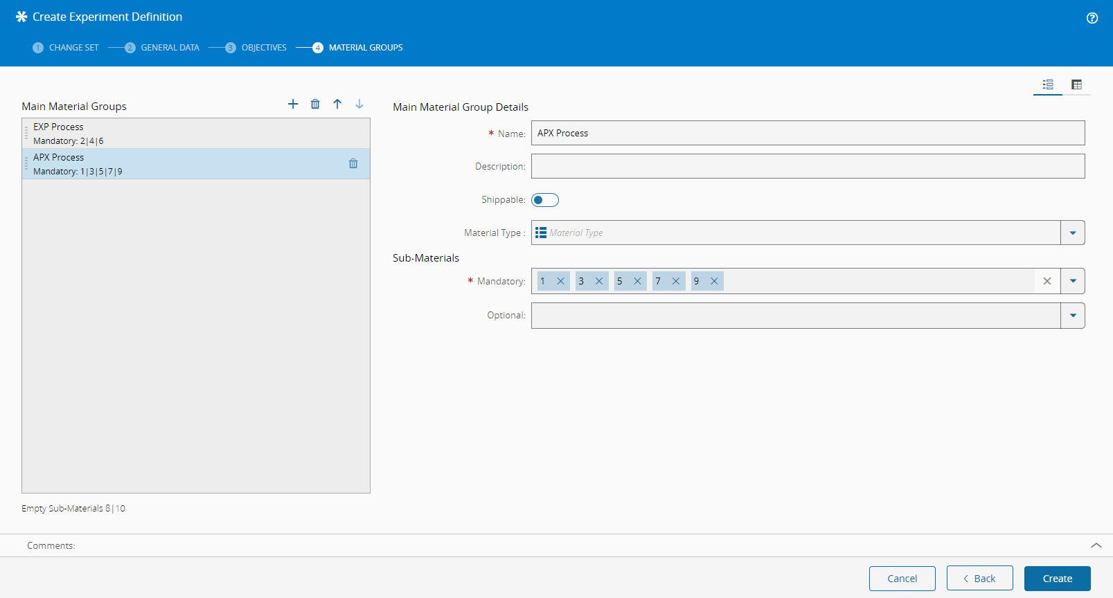 trueorfalse, depending on your preferences. Define if shipping these Sub-Materials is allowed during the experiment. - Material Type - restrict the material type by defining the type of Sub-Materials that will be set when assigned to the Experiment Definition - only if Group is Main.