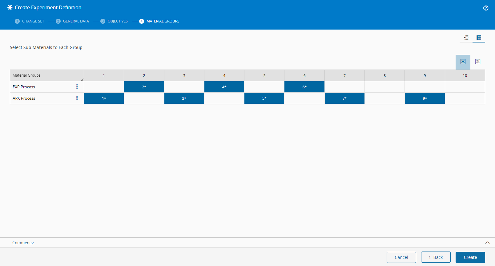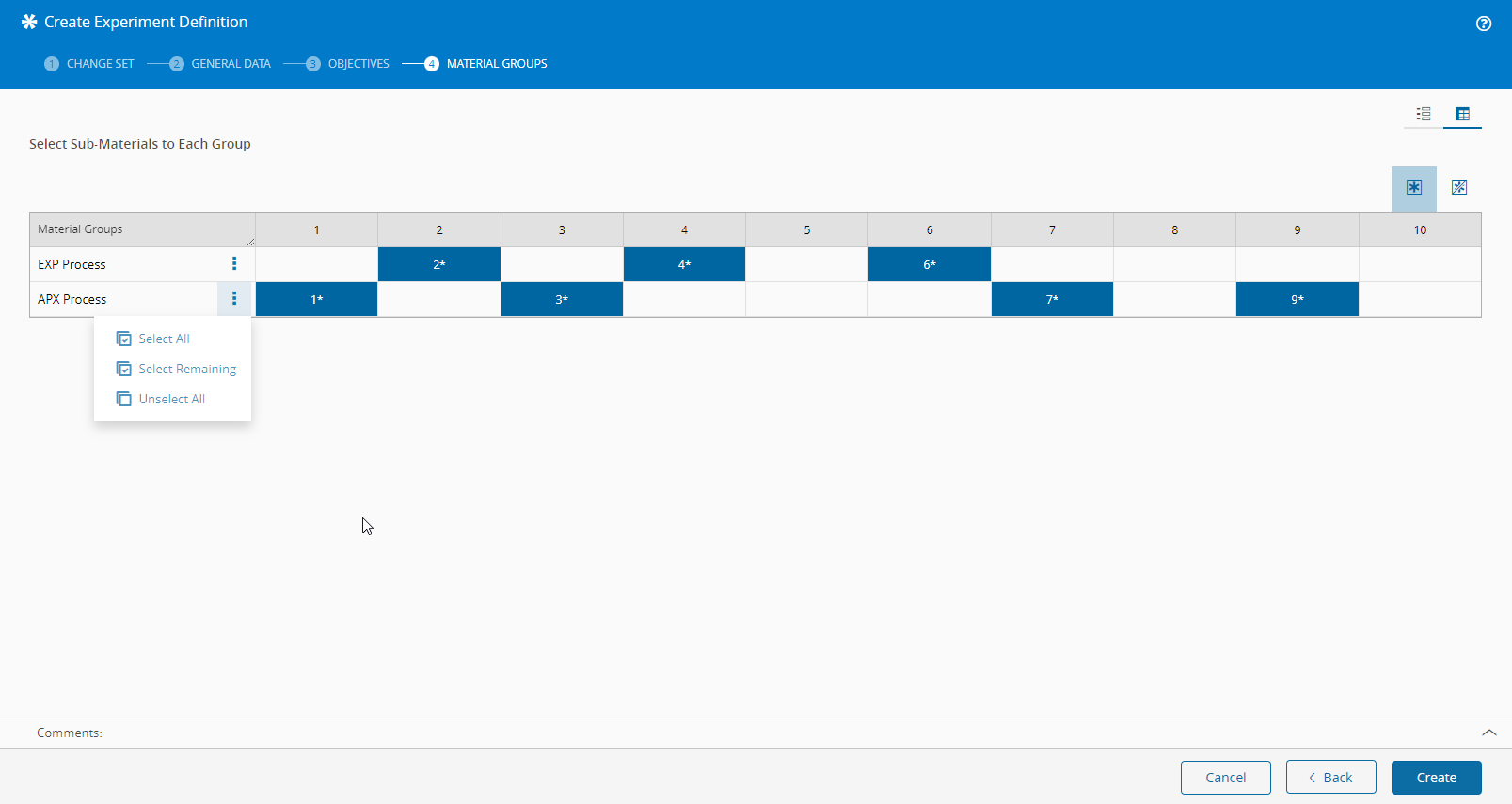 It is possible to assign or dissociate any sub-material numbers to any Material Group by selecting it on the matrix. All numbers need to be assigned and each number can only be part of a single Material Group. When finished, select Create.