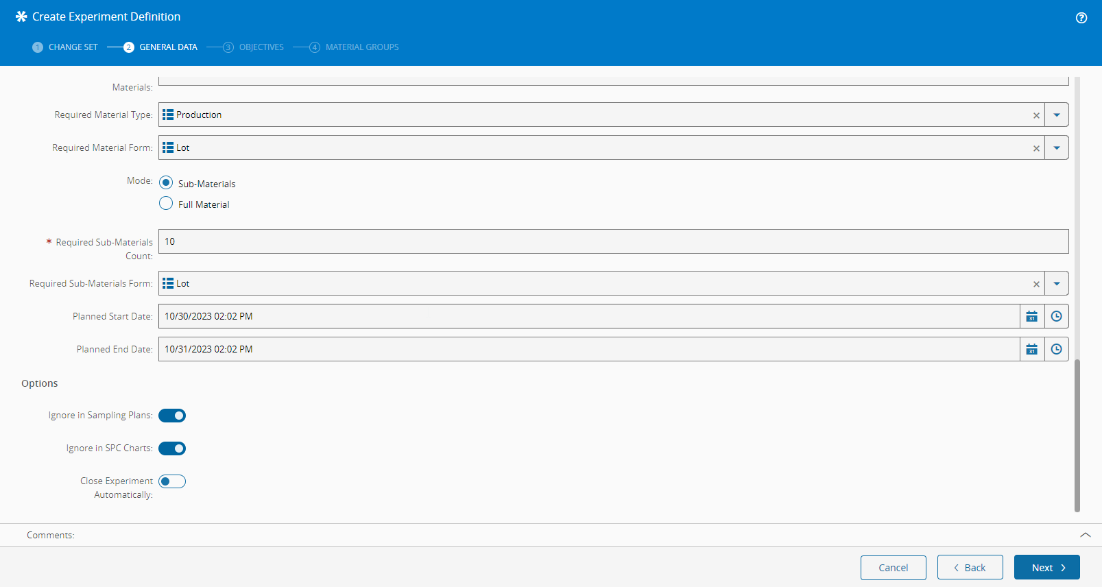 - Sub-Materials - if you select this option, you will have to indicate the number of Sub-Materials in the Required Sub-Materials Count field below. The value to enter in Required Sub-Materials Count must be > 0 (zero), because a value of zero means that this Experiment Definition refers to a full lot experiment. Additionally, you will have to enter the Required Sub-Materials Form.