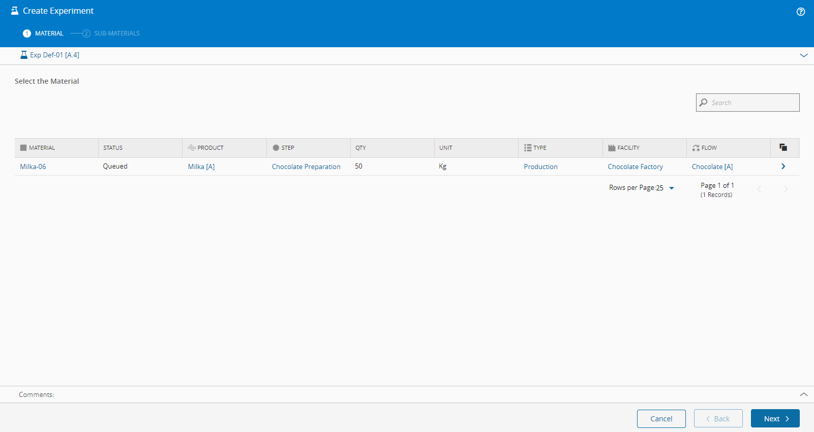 Alternatively, create the Experiment by selecting an existing Material, selecting the button Create Experiment and then choosing an Experiment Definition.