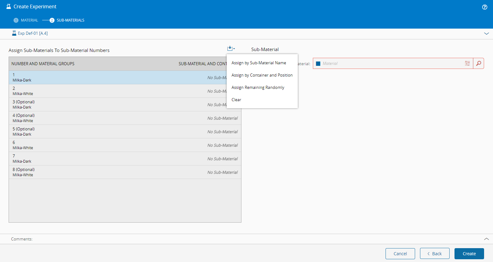 - Assign by Sub-Material Name - the first experiment number is assigned with the first Sub-Material sorted by name (ASC).