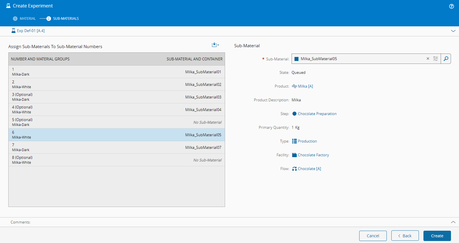 - In case the Experiment mode is Sub-Materials, all Sub-Materials to be attached to the experiment must have the following properties cleared (that is not set): Experiment and Experiment Sub-Material Number.