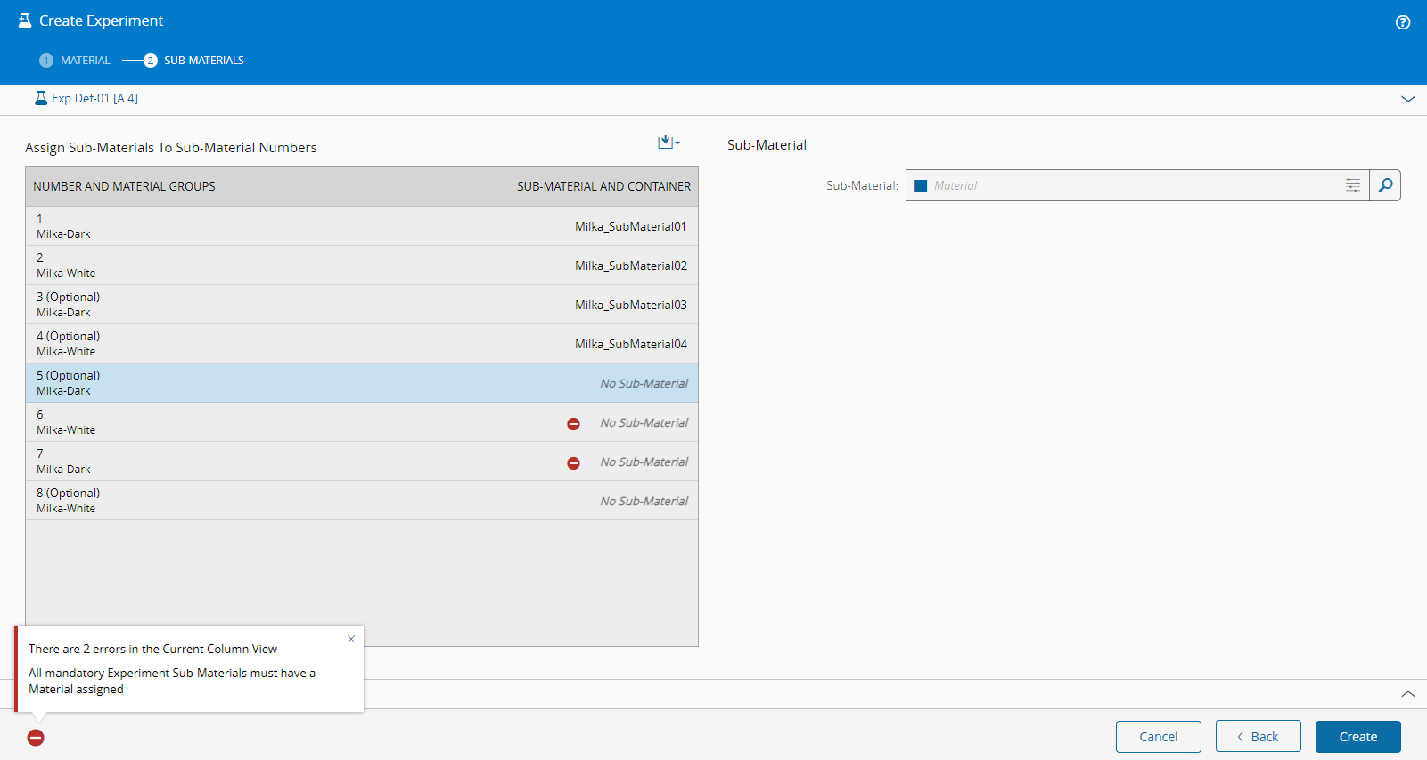 When assigning Materials to the Experiment, if the number of Available Sub-Materials is less than the total number of Sub-Materials specified in the Experiment Definition (which includes Mandatory plus Optional Sub-Materials), the Mandatory positions must be assigned first in a sequential order. Otherwise, the system will show the error in the image below.