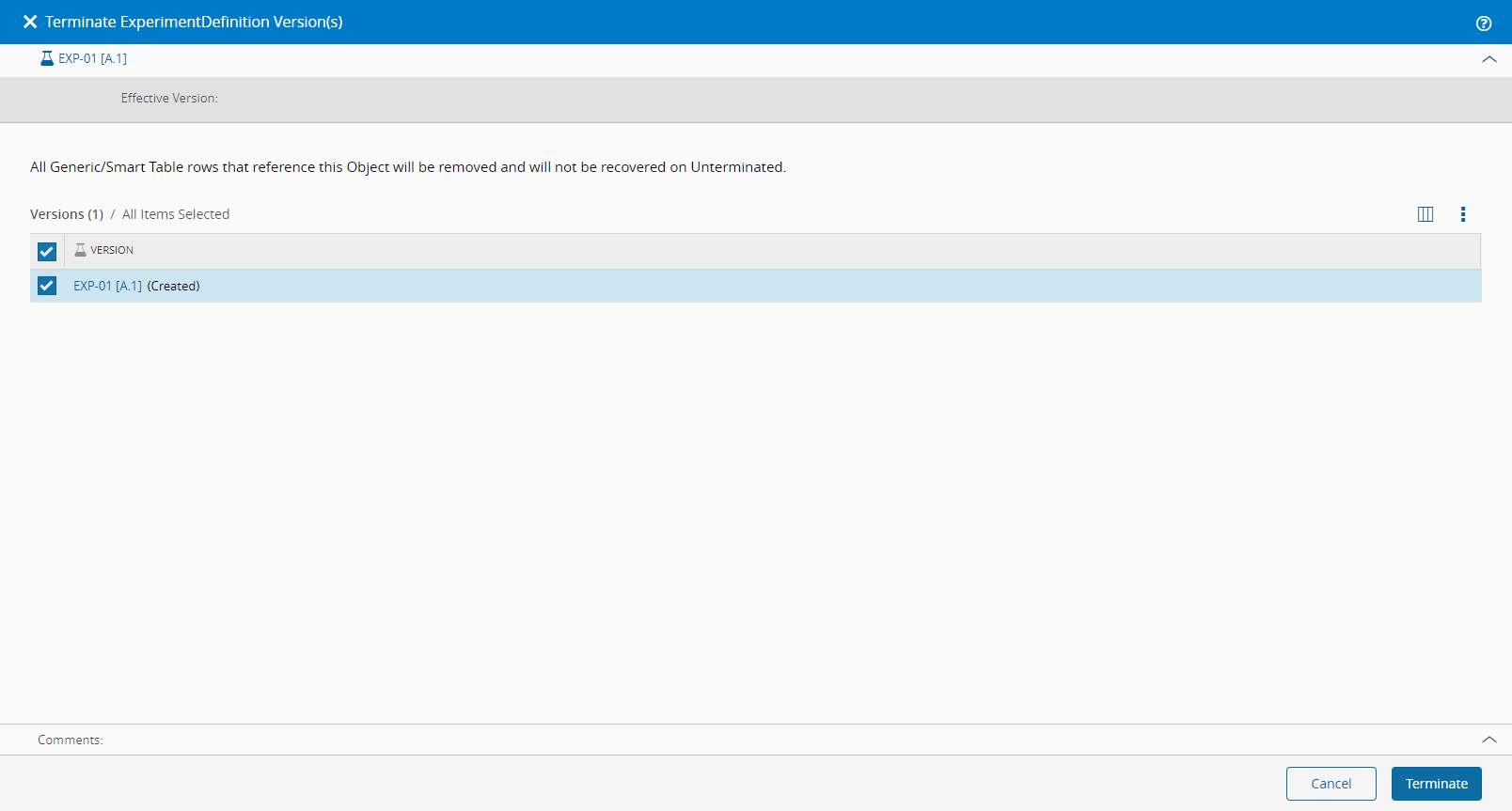 - Select Terminate to perform the operation. All generic/smart table rows that reference the current object will be removed and will not be recovered if the object is unterminated at a later point.