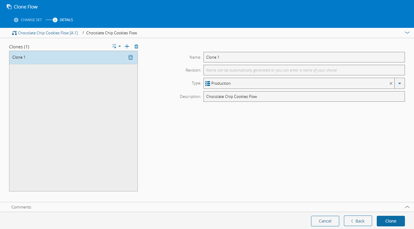 The Clone Flow wizard can be called from the Flow page within the Business Data Group. The default values will be taken from the current Flow to be used as a base for the new object. Since this is a versioned entity, there are two possible procedures: entity and revision cloning, both of which are available from the main details page. Select the Clone option accessible through the three vertical dots, followed by Flow if you want to clone the complete entity along with the first revision and version of the new entity, or Revision if you want to clone only a single revision. In either case, a Change Set must be supplied for a version of the revision to be made effective in the future.