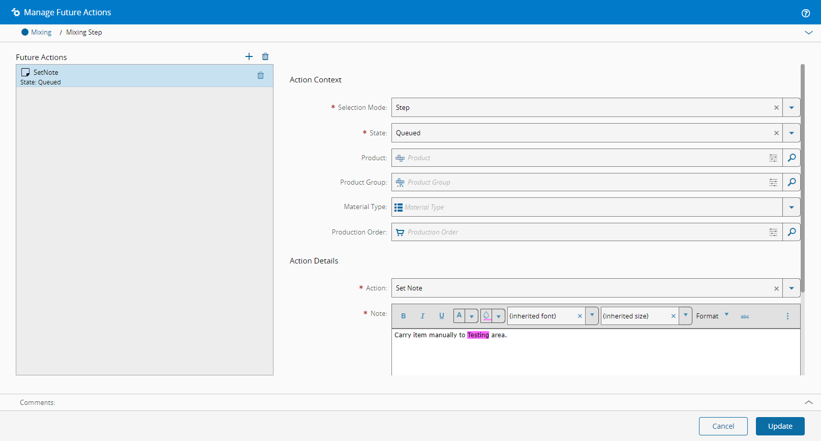 This operation is used to define Future Actions to be applied to a Material while at a Step.