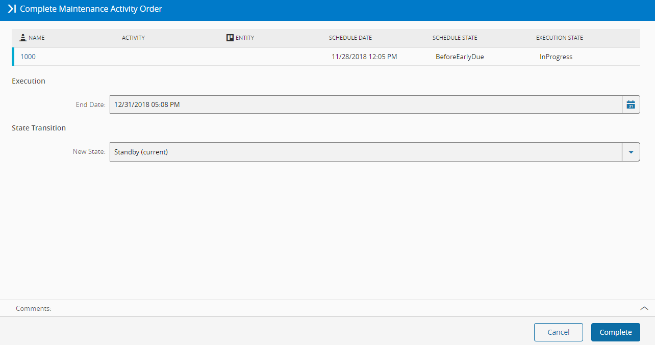 This operation completes the execution of a Maintenance Activity Order (MAO) which is In Progress.
