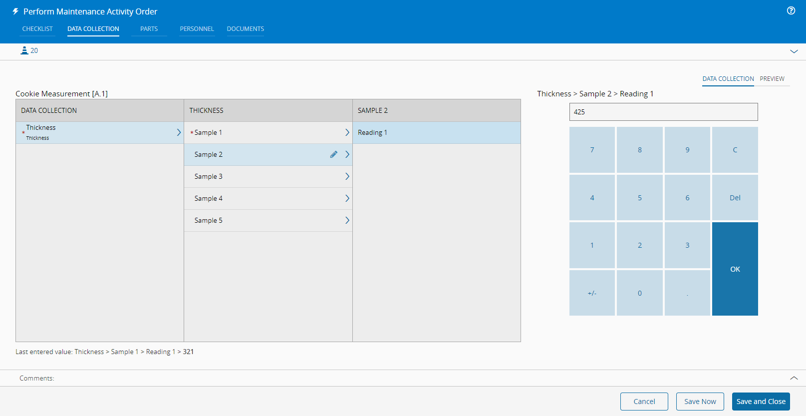 You can switch between the Checklist, Parts, Data Collection, Labor and Documents by selecting the respective tab.